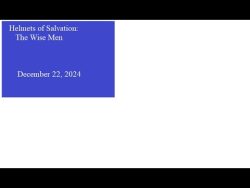 The Helmets of Salvation: The Wise Men -December 22, 2024 December 29, 2024 Video Message: The Helmets of Salvation: The Wise Men By: Reverend Vickie Perkins Date: December 22, 2024 Type: Combined SHARE ON Twitter Facebook Buffer LinkedIn Pin It Leave a Reply Cancel replyYour email address will not be published. Required fields are marked *Comment * Name * Email * Website Δ Continue Reading The Armor of God: Prayer – December 29, 2014 You Just Get Used to It – January 5, 2025